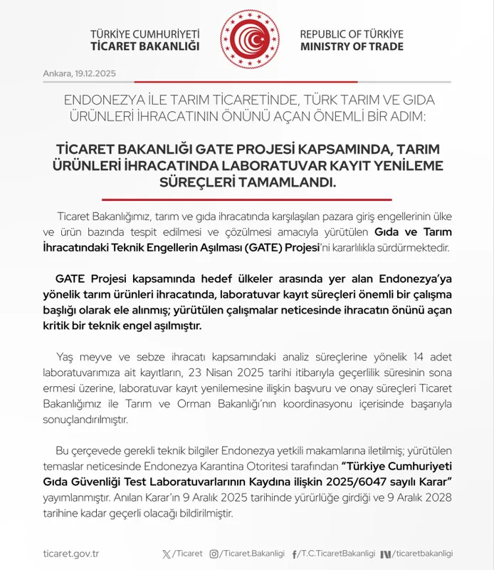 Ticaret Bakanlığı, GATE Projesi kapsamında, Endonezya'ya tarım ve gıda ürünleri ihracatında yaşanan teknik engelleri kaldırdı. 14 laboratuvarın kayıt yenileme süreçleri tamamlanarak, 16 ürün için ihracat güvenli ve kesintisiz şekilde sürdürülebilecek.