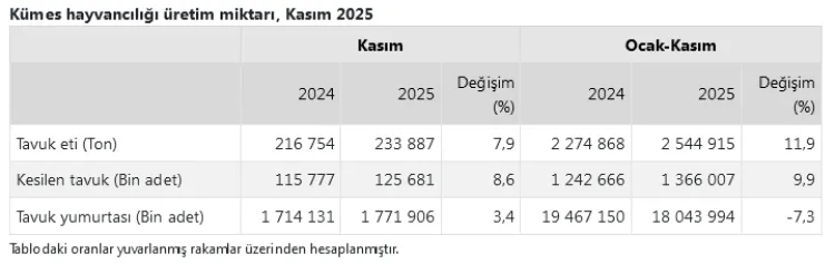 Ocak-Kasım döneminde ise üretim kalemlerinde farklı bir tablo ortaya çıktı. Aynı dönemde; Tavuk yumurtası üretimi yüzde 7,3 azalırken, kesilen tavuk sayısı yüzde 9,9 arttı, tavuk eti üretimi yüzde 11,9 artış gösterdi.