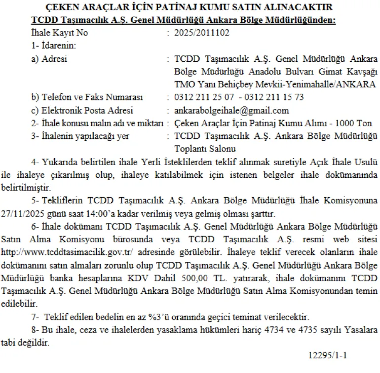TCDD Taşımacılık A.Ş. Ankara Bölge Müdürlüğü, çeken araçlarda kullanılmak üzere 1000 ton patinaj kumu alımı için 27 Kasım 2025'te açık ihale düzenleyeceğini duyurdu.
