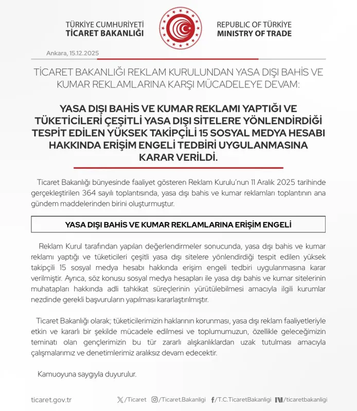 Bakanlık sosyal medya hesabından yapılan duyuruda, yasa dışı bahis ve kumar reklamı yaptığı ve tüketicileri çeşitli yasa dışı sitelere yönlendirdiği tespit edilen yüksek takipçili 15 sosyal medya hesabına erişim engeli tedbiri uygulanmasına karar verildiği belirtilirken, kararın 7258 sayılı Kanun kapsamında Reklam Kurulu'nun yetkileri doğrultusunda alındığı kaydedildi.