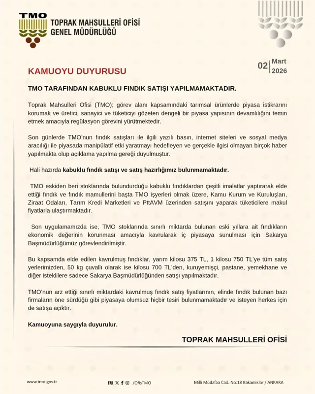 Toprak Mahsulleri Ofisi (TMO), sosyal medyada ve bazı basın organlarında çıkan kabuklu fındık satış haberlerini yalanladı. Kurum, stoklarında kabuklu fındık bulunsa da satış ve satış hazırlığı bulunmadığını, piyasaya olumsuz bir etkisinin olmadığını duyurdu.