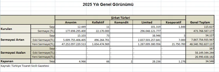 Aralık 2025 özelinde ise kurulan şirket sayısı, Aralık 2024'e göre yüzde 1,1, kurulan gerçek kişi ticari işletme sayısı yüzde 4,5 artış gösterdi. Aralık ayında kurulan kooperatif sayısı ise yüzde 11,7 azaldı. Bir önceki aya göre ise kurulan şirket sayısında yüzde 34,7, kurulan gerçek kişi ticari işletme sayısında yüzde 44,4, kurulan kooperatif sayısında yüzde 18,6 oranında artış yaşandı. Kapanan işyerlerinde ise şirketler yüzde 193,6, kooperatifler yüzde 284,9 ve gerçek kişi ticari işletmeler yüzde 103,4 oranında artış gösterdi.