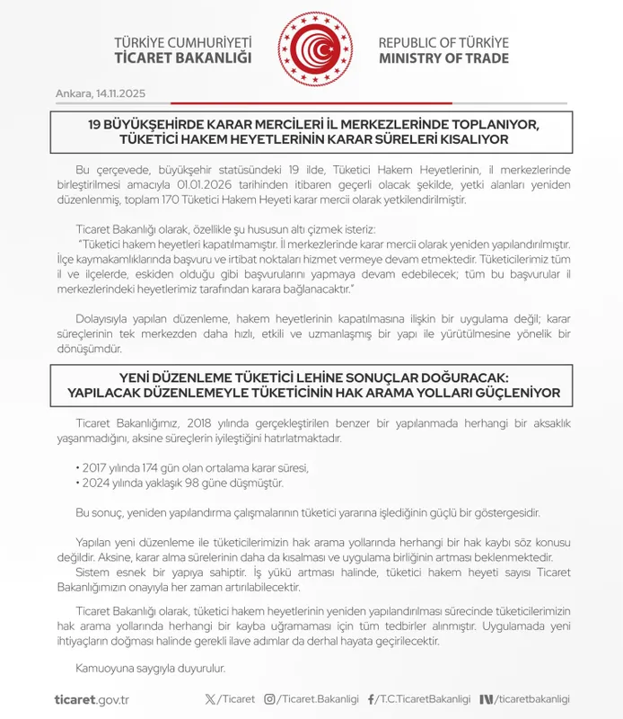 Hizmet kalitesinin artırılması, karar sürelerinin kısaltılması ve uygulama birliğinin sağlanması amacıyla hakem heyetlerinin il merkezlerinde toplanacağının altı çizilen açıklamada, bu kapsamda 19 büyükşehirde yetki alanlarının yeniden düzenlendiği ve 1 Ocak 2026 itibarıyla toplam 170 hakem heyetinin karar mercii olarak yetkilendirildiği açıklandı.