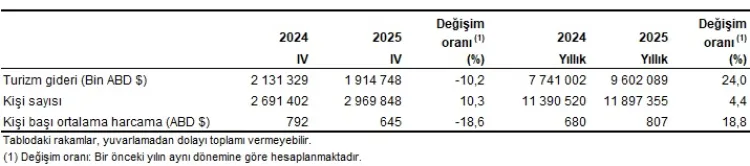 2025 yılı genelinde ziyaretçilerin yüzde 67,7'si Türkiye'ye "gezi, eğlence, sportif ve kültürel faaliyetler" amacıyla geldi. Yurt dışı ikametli vatandaşlar ise yüzde 63,4 ile en çok "akraba ve arkadaş ziyareti" amacıyla ülkeyi ziyaret etti. Yurt içinde ikamet edip yurt dışına çıkan vatandaşların harcamalarından oluşan turizm gideri, 2025 yılında yüzde 24 artarak 9 milyar 602 milyon 89 bin dolar oldu. Yurt dışını ziyaret eden vatandaş sayısı ise yüzde 4,4 artışla 11 milyon 897 bin 355 kişiye ulaştı. Kişi başı ortalama harcama 807 dolar olarak gerçekleşti.
