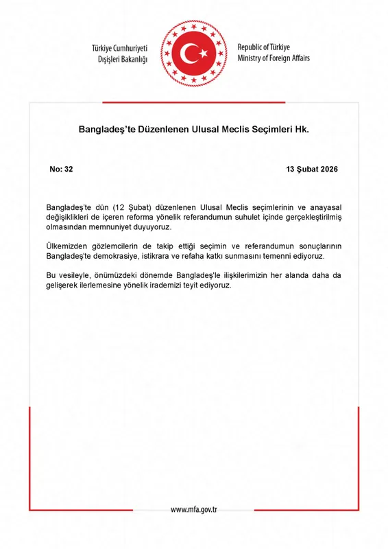 Dışişleri Bakanlığı, Bangladeş'teki seçim ve referandumun huzur içinde gerçekleşmesinden memnuniyet duydu. Türkiye'nin gözlemci olarak katıldığı süreçte, sonuçların demokrasiye katkı sağlaması temenni edildi.