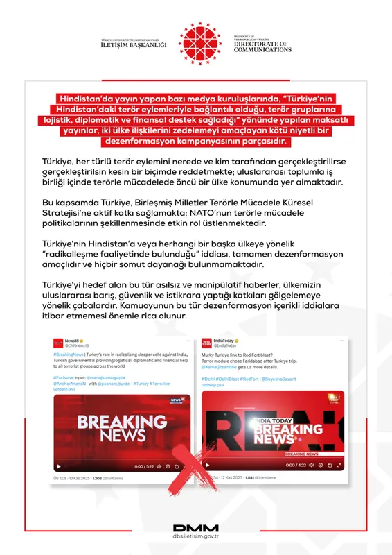 İletişim Başkanlığı Dezenformasyonla Mücadele Merkezi'nden yapılan açıklamada, bu tür iddiaların iki ülke ilişkilerini zedelemeyi amaçlayan kötü niyetli bir dezenformasyon kampanyasının parçası olduğu vurgulandı.
