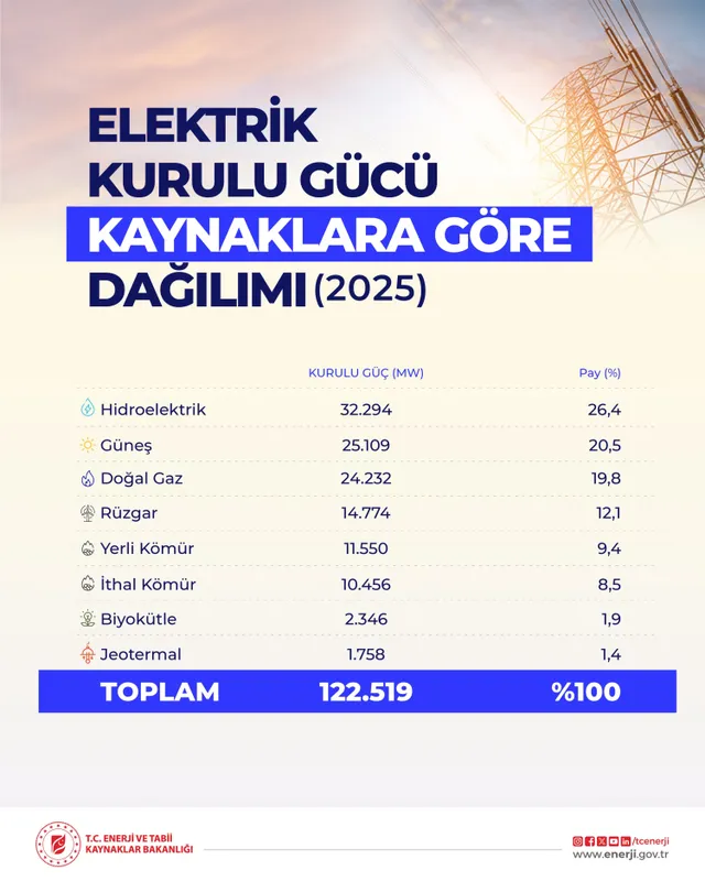 İşte 2025 yılı verilerine göre elektrik kurulu gücü kaynaklarına göre dağılımı şöyle: