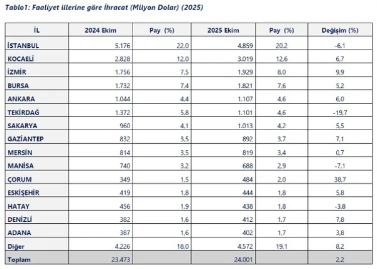 Ekim 2025'te iller bazında ihracat sıralaması ise şöyle: İstanbul 4,859 milyar dolar ile ilk sırada, Kocaeli 3,019 milyar dolar ile ikinci, İzmir 1,929 milyar dolar ile üçüncü, Bursa 1,821 milyar dolar ile dördüncü ve Ankara 1,107 milyar dolar ile beşinci sırada yer aldı.