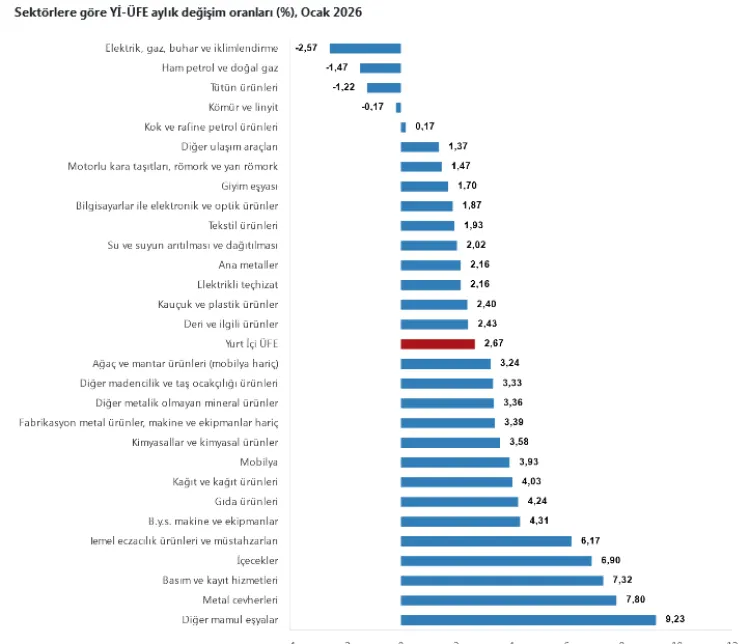 TÜİK verilerine göre, Ocak ayında yurt içi üretici fiyat endeksi (Yİ-ÜFE) bir önceki yılın aynı ayına göre yüzde 27,17 arttı. Sanayinin 4 ana sektöründeki yıllık değişimlerde su teminindeki artış yüzde 37,21 ile dikkat çekti.