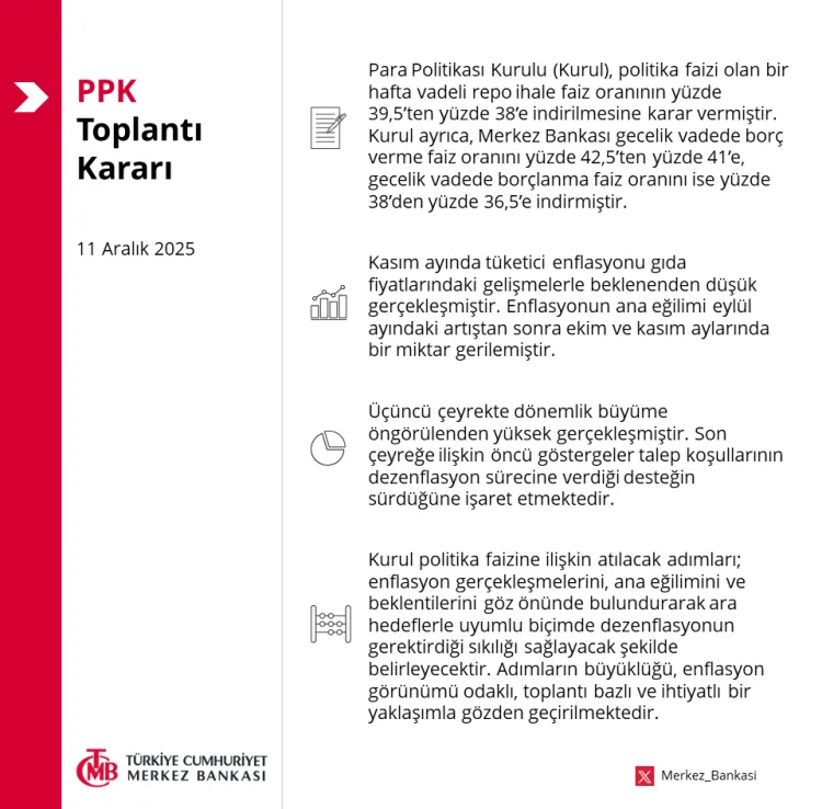 Merkez Bankası Para Politikası Kurulu yılın son faiz kararını açıkladı. 1 hafta vadeli repo ihale faiz oranı 150 baz puan indirildi. Politika faizi, yüzde 39,5 seviyesine yüzde 38'e indirirken, gecelik vadede borçlanma faiz oranını ise yüzde 38'den yüzde 36,5'e indirildi.