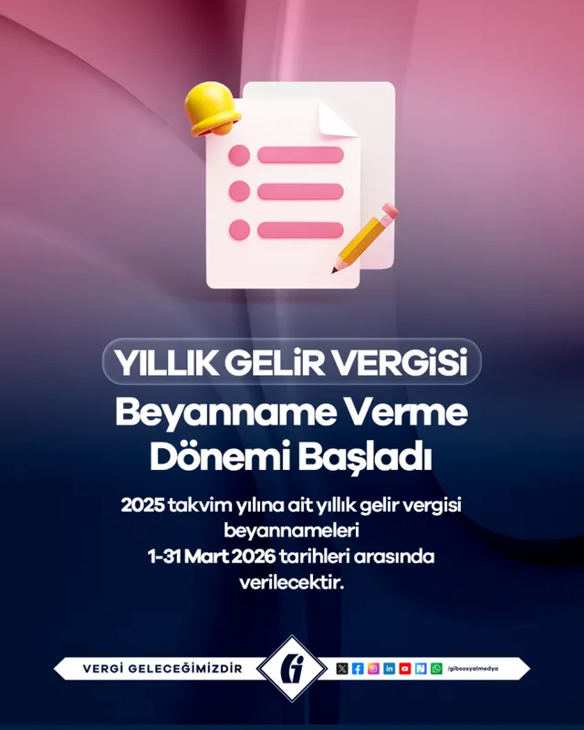 2025 takvim yılına ilişkin yıllık gelir vergisi beyannameleri 1–31 Mart 2026 tarihleri arasında verilecek. İlk taksit ve damga vergisi ile birlikte 31 Mart, ikinci taksit ise 31 Temmuz 2026'ya kadar ödenecek.