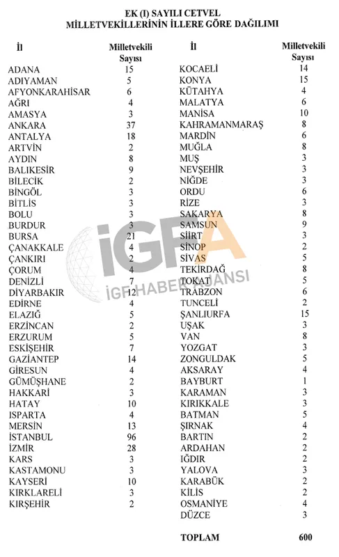 YSK, milletvekillerinin illere göre dağılımını şöyle gerçekleştirdi.