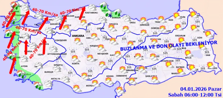 Sabah ve gece saatlerinde iç ve doğu kesimlerde buzlanma, don, pus ve sis etkili olacak. Hava sıcaklıkları kuzey, iç ve batı bölgelerde artarak normallerin üzerine çıkması bekleniyor. Rüzgârın ise Marmara, Ege ve Batı Karadeniz'de güneyli yönlerden kuvvetli ve yer yer fırtına şeklinde (40-70 km/sa) esmesi öngörülüyor.