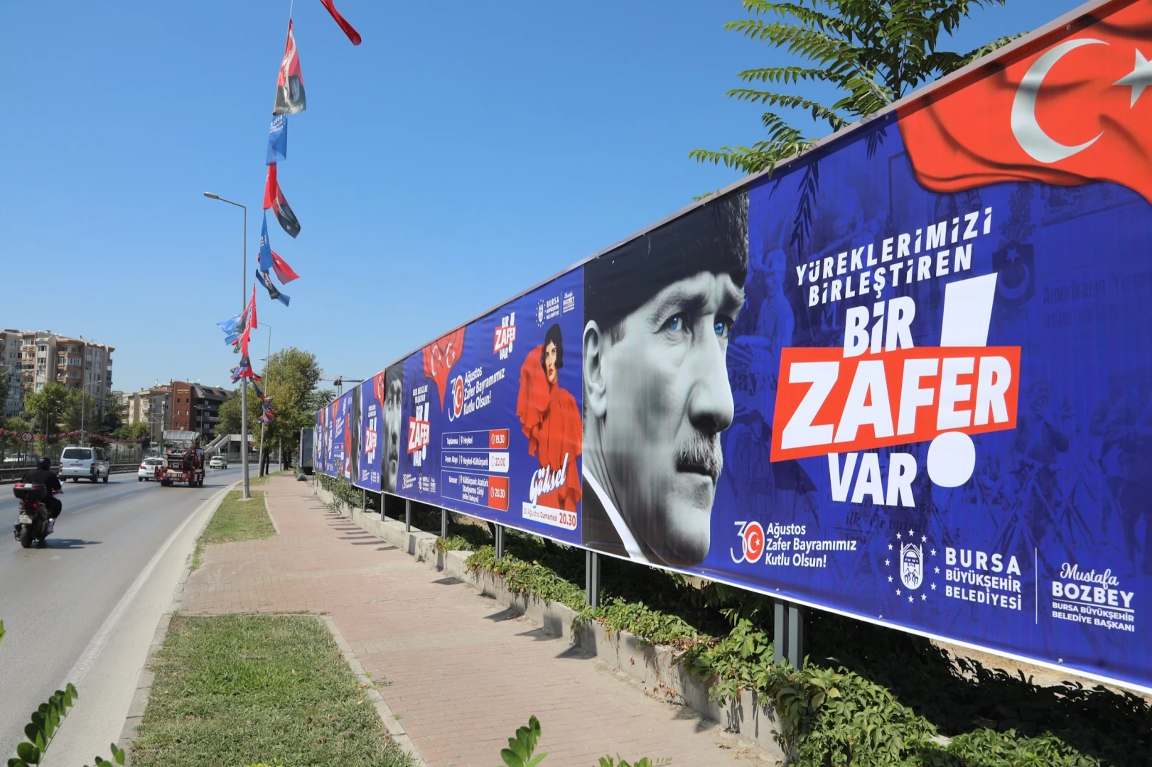 Bu kapsamda bağımsızlığın simgesi, Cumhuriyetimizin kuruluşuna giden yolun mihenk taşı olan 30 Ağustos Zafer Bayramı için kentin dört bir yanı, ‘Yüreklerimizi Birleştiren, Yolumuzu Aydınlatan, Yarınlara İlham Olan, Her Nesilde Yaşayan, Bir Zafer Var’ temalı billboardlarla süslendi.