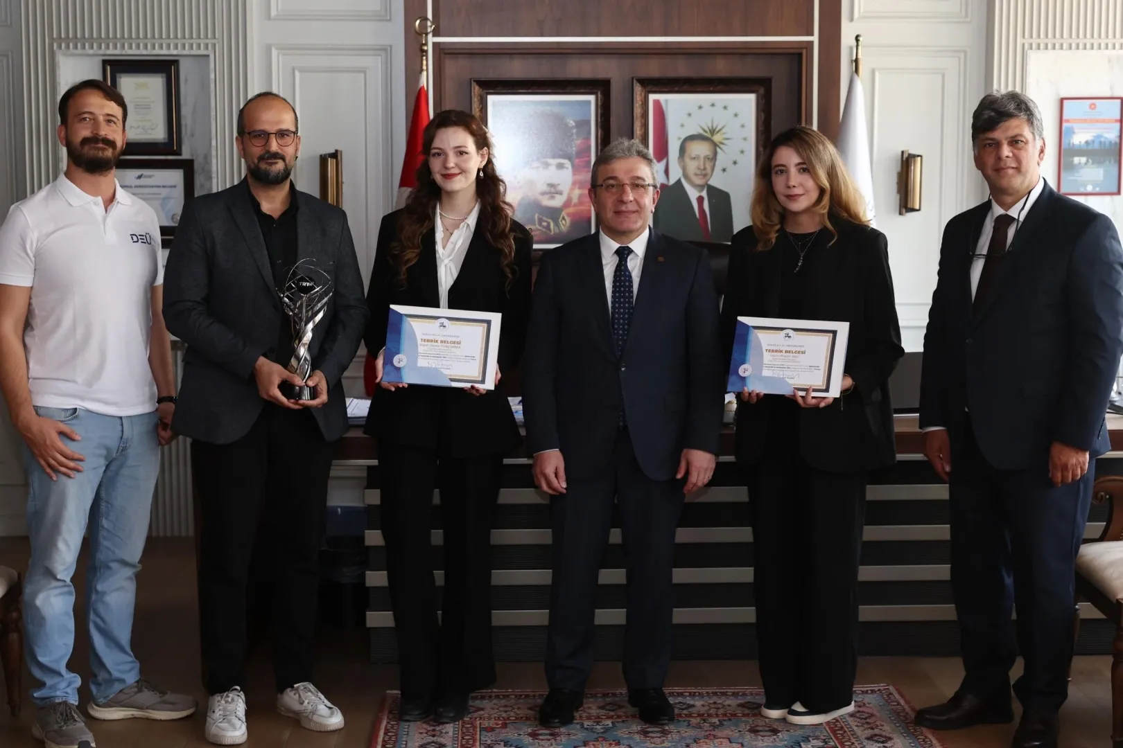 Başarının ardından GSF Dekan Vekili Prof. Dr. Serdar Aybek, Bölüm Başkanı Doç. Dr. Çağdaş Ülgen, proje danışmanı Dr. Öğr. Üyesi Memet Ali Zeren ve ödül sahibi öğrenciler, DEÜ Rektörü Prof. Dr. Bayram Yılmaz’ı makamında ziyaret etti. Rektör Yılmaz, öğrencilere başarı belgelerini takdim ederek tebriklerini iletti.