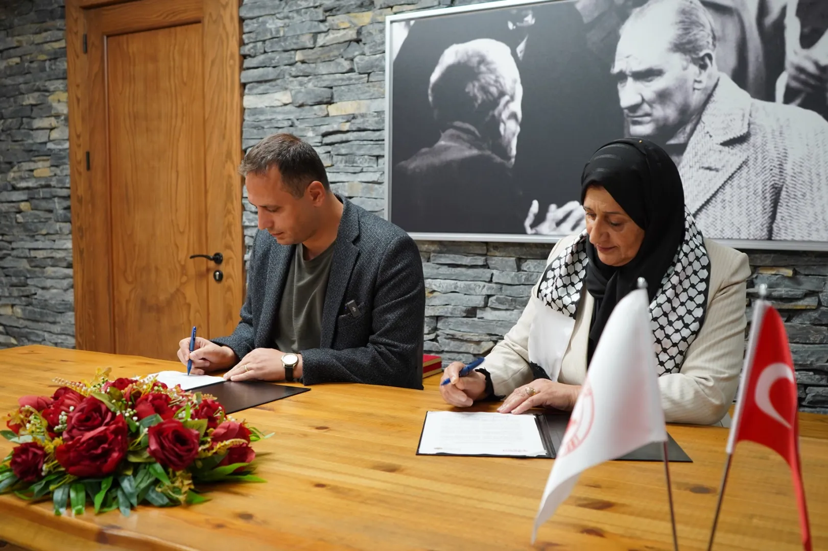 Filistin heyeti de Başkan Eşki’ye, Filistin’in özgürlük mücadelesini anlatan bir tablo hediye etti. Ziyaretin sonunda iki belediye arasında niyet mektubu imzalanarak, kısa süre içinde kardeş şehir ilişkilerinin resmileştirilmesi yönünde kararlılık ortaya konuldu.