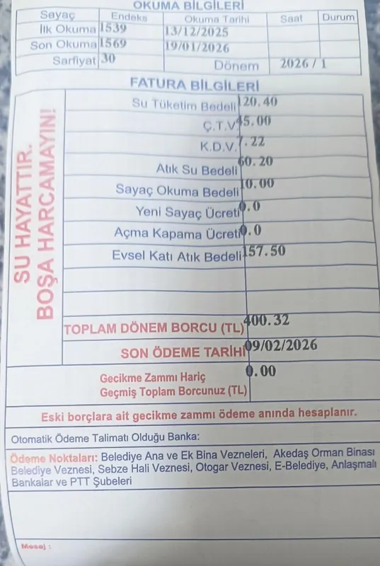 Adıyaman'da bir vatandaşa gelen Ocak 2026 su faturası sosyal tepkilere yol açtı. 30 metreküp su tüketimi için 400 lira 32 kuruş fatura kesilirken, toplam tutarın büyük bölümünü ek bedeller oluşturdu.