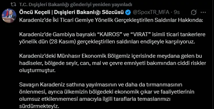 ANKARA (İGFA) - Dışişleri Bakanlığı Sözcüsü Öncü Keçeli, Karadeniz'de Gambiya bayraklı KAIROS ve VIRAT adlı ticari tankerlere 28 Kasım'da düzenlenen saldırılara ilişkin yazılı bir açıklama yaptı.