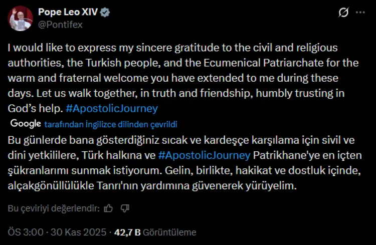 Öteyandan Papa XIV. Leo, Türkiye'den ayrılmadan önce sosyal medya hesabından yaptığı paylaşımda, "Bu günlerde bana gösterdiğiniz sıcak ve kardeşçe karşılama için sivil ve dini yetkililere, Türk halkına ve Ekümenik Patrikhane'ye en içten şükranlarımı sunuyorum. Gelin, birlikte, hakikat ve dostluk içinde, alçakgönüllülükle Tanrı'nın yardımına güvenerek yürüyelim." ifadelerini kullandı.