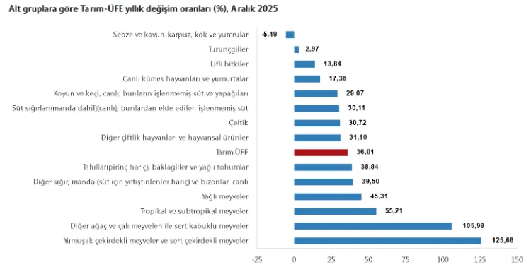 Sektörel bazda değerlendirildiğinde, Aralık ayında tarım ve avcılık ürünleri ile ilgili hizmetlerde yüzde 3,00, ormancılık ürünleri ve ilgili hizmetlerde yüzde 1,59, balık ve diğer balıkçılık ürünleri ile su ürünlerinde ise yüzde 6,25 artış gerçekleşti.