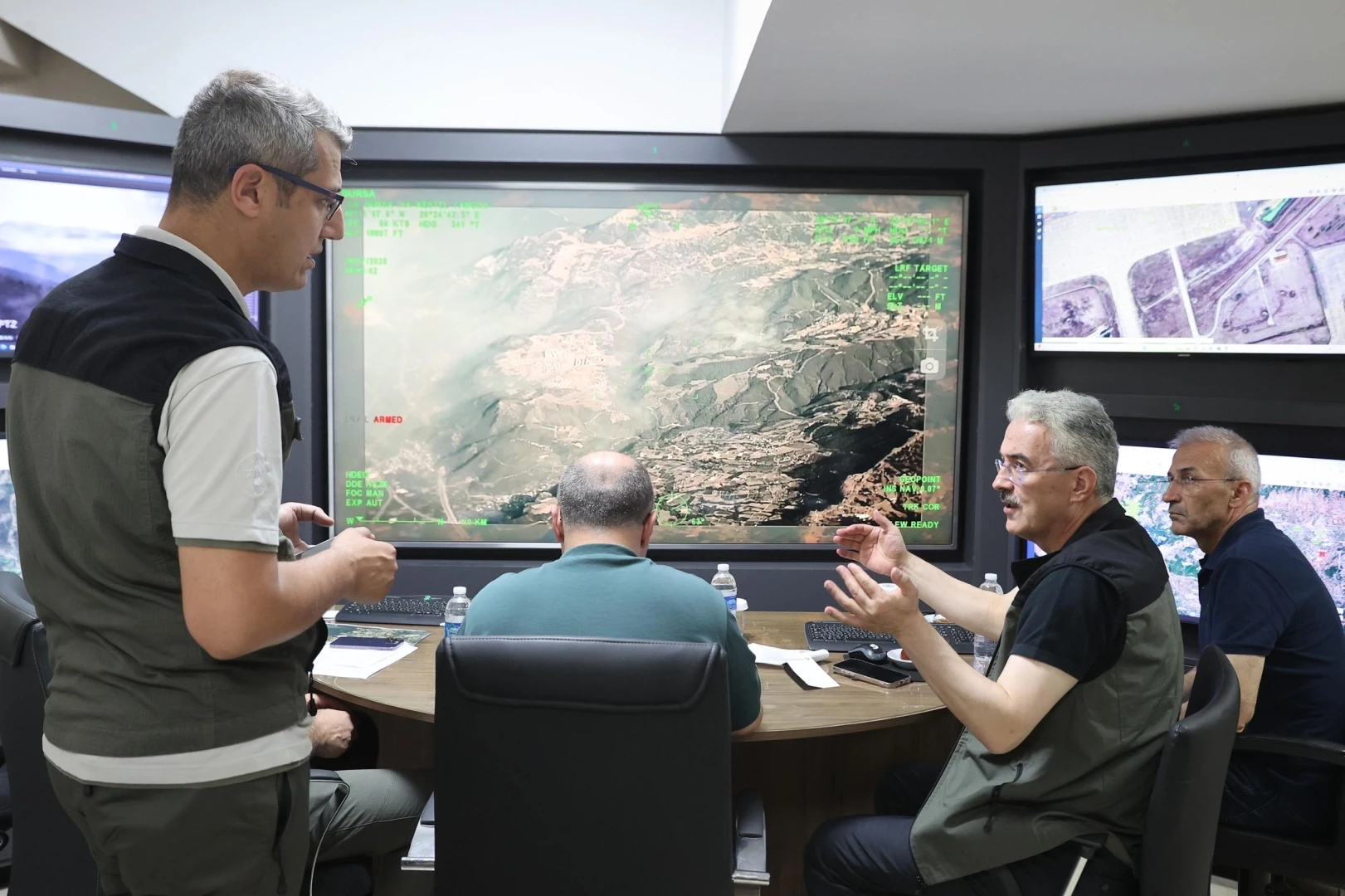 Tarım ve Orman Bakan Yardımcısı Prof. Dr. Ahmet Gümen, Bursa Valisi Erol Ayyıldız, Bursa Milletvekili Mustafa Varank, İl Emniyet Müdürü ve İl Jandarma Komutanı, Bursa Orman Bölge Müdürlüğü Yangın Harekât Merkezi’nde bir araya gelerek yangınla mücadele çalışmalarını koordine ediyor.