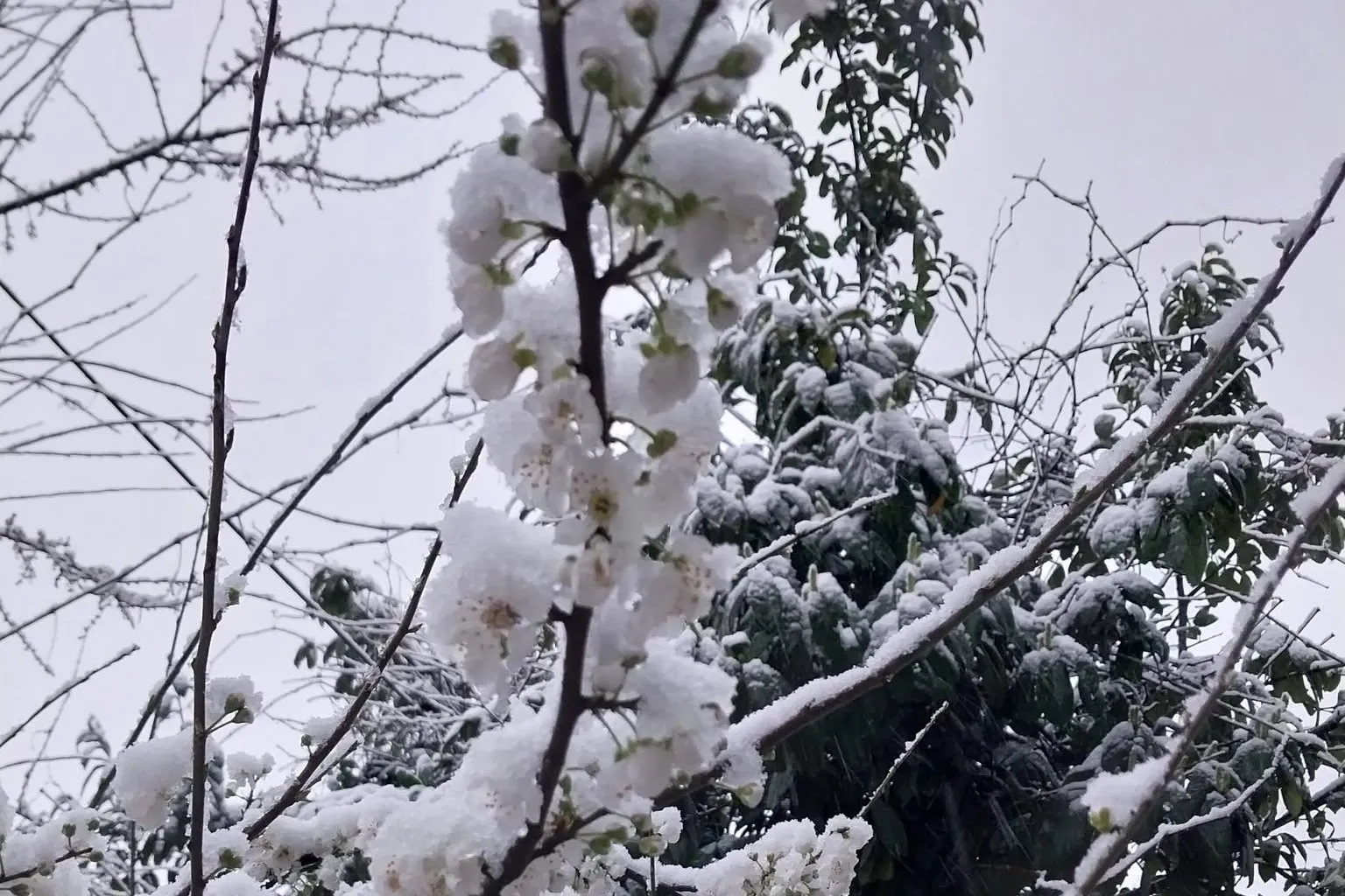Düzce'de Kaynaşlı ilçe merkezinde güneşli havaya aldanarak erken çiçek açan erik ağacı, ardından yağan karla birlikte kartpostallık manzaralar ortaya çıkardı.